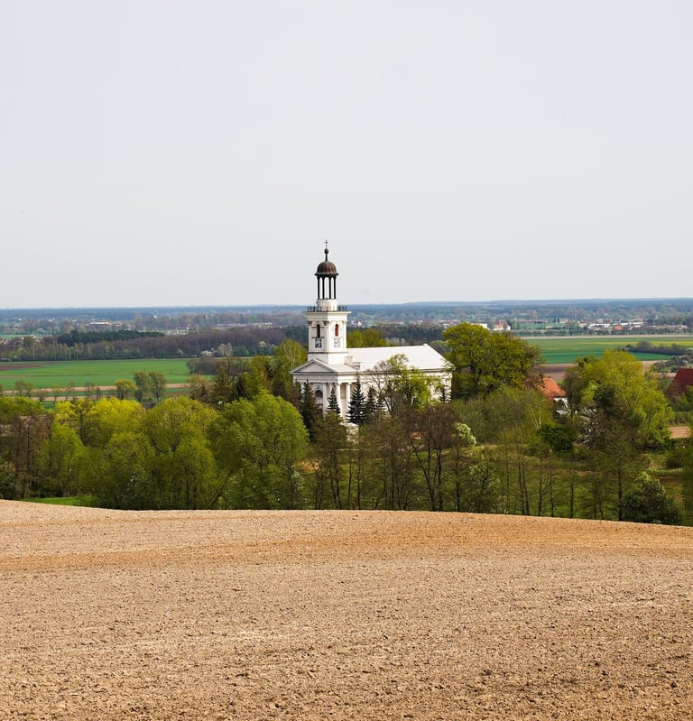 Drewniana platforma widokowa to idealne miejsce do kontemplacji romantycznego pejzażu. Rozległe pola i łąki tworzą sielankowy krajobraz, przypominający Soplicowo. Wśród tej malowniczej scenerii wyróżniają się dwa budynki. Po prawej stronie znajduje się kościół we wsi Brzóstków – monumentalna, biała świątynia, charakterystyczna dla wielkopolskich wsi. Choć Adam Mickiewicz nie miał okazji odwiedzić tego miejsca (kościół powstał na miejscu starszej, drewnianej świątyni już po jego wizycie w Wielkopolsce), warto zajrzeć do środka. Przy odrobinie szczęścia można zobaczyć elementy wyposażenia pochodzące ze starszego kościoła – kto wie, może na te same zabytki patrzył sam wieszcz?