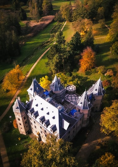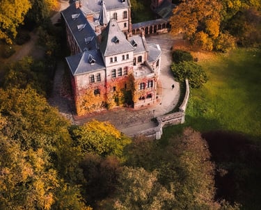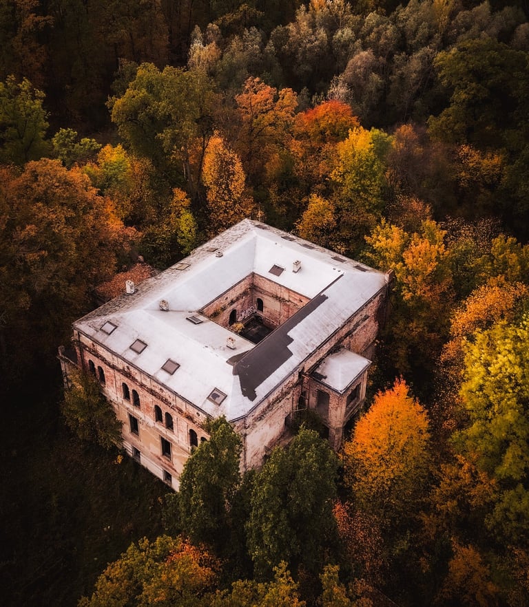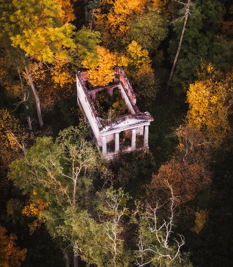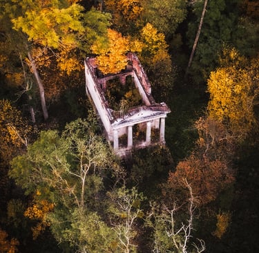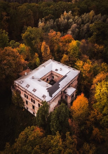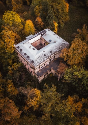Nasza ciekawość jednak nie ograniczyła się do pałacu, o nie! Latając naszym dronem, zobaczyliśmy jeszcze jeden ciekawy budynek, więc postanowiliśmy poznać i jego sekrety. Tu nie było już tak łatwo — przez gęste krzaki przedzieraliśmy się trochę po omacku, aż w końcu dotarliśmy do starego mauzoleum Cohnów, kolejnych właścicieli pałacu. Wchodząc do środka na własną odpowiedzialność, byliśmy zdumieni, jak przyroda opanowała ruiny, tworząc coś niezwykłego — prawdziwą gratkę dla fanów urbexu i klimatycznych miejsc.